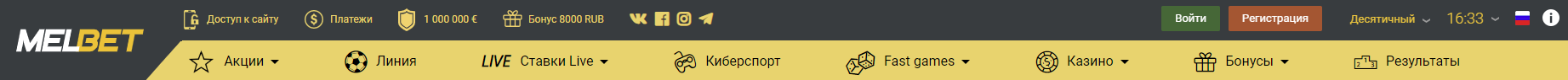 На главной странице официального сайта Мелбет находятся такие важные меню, как:
